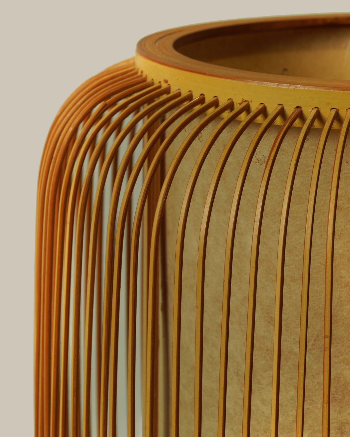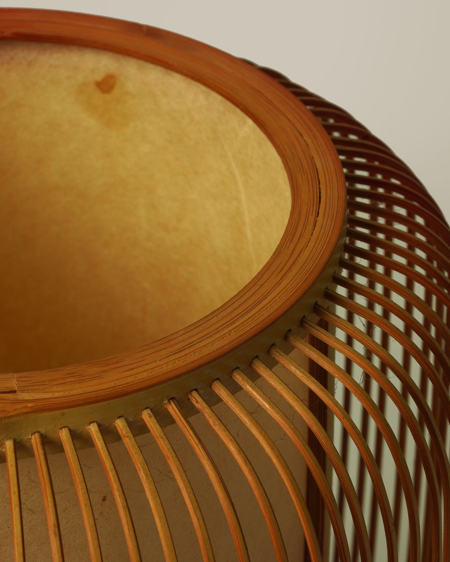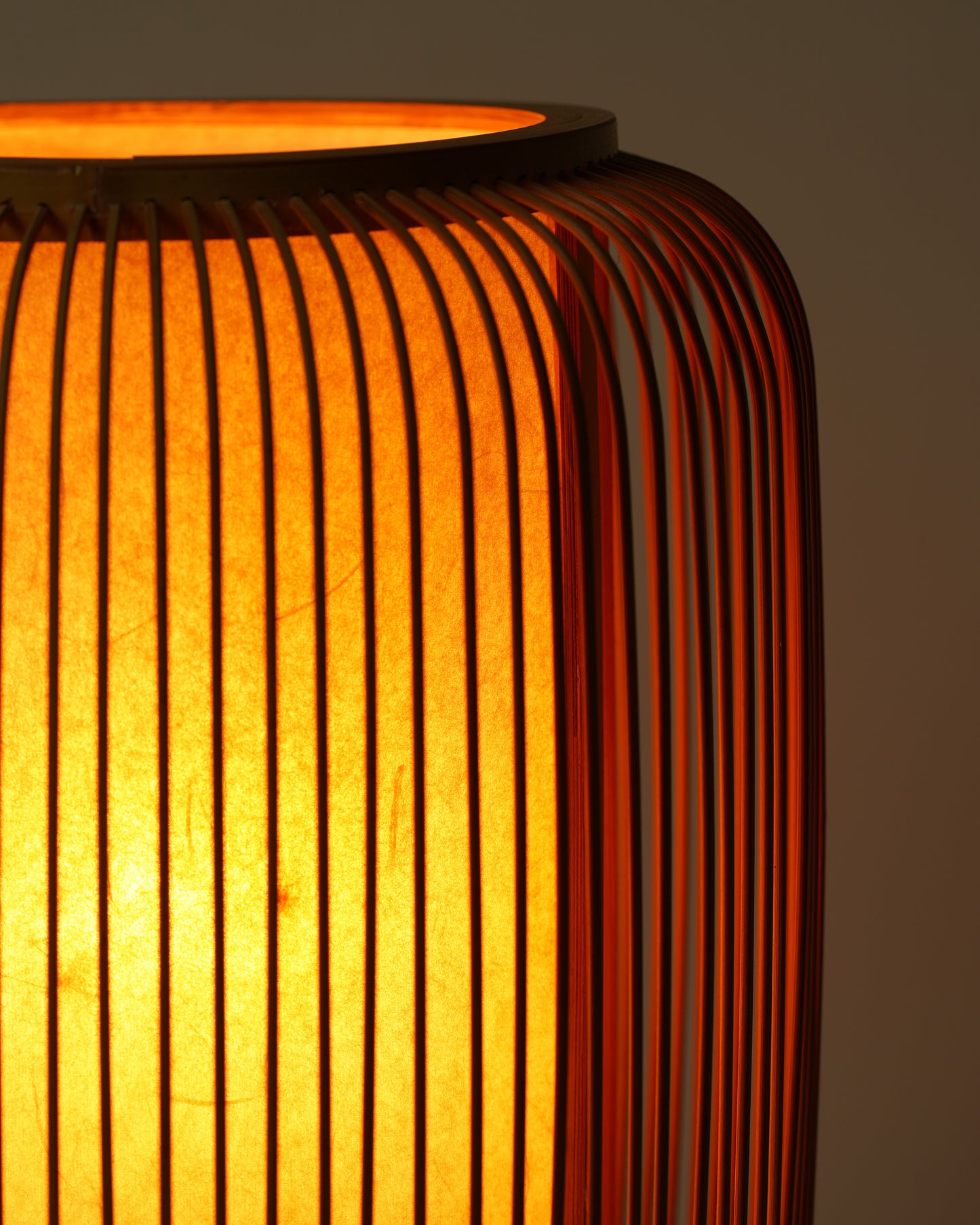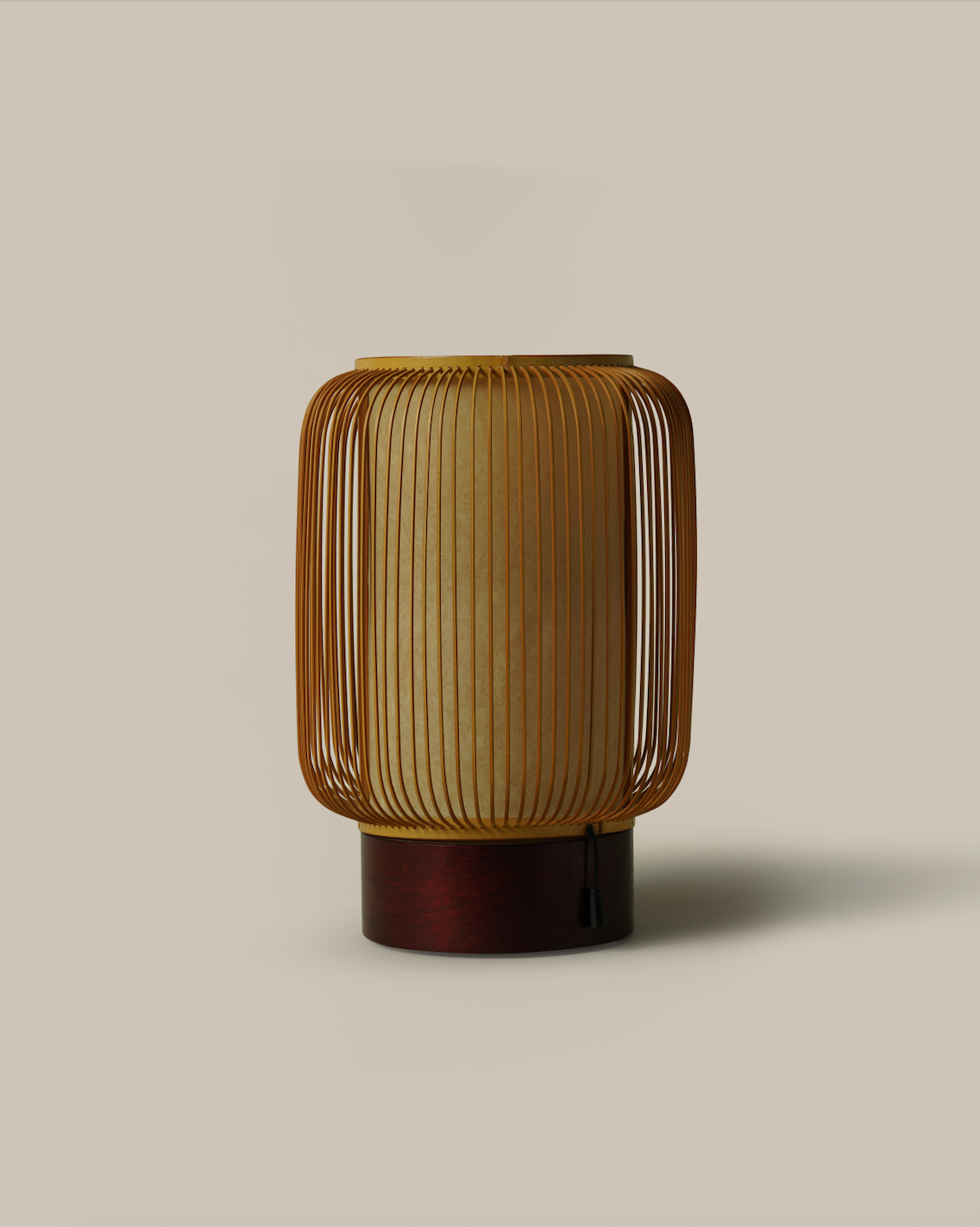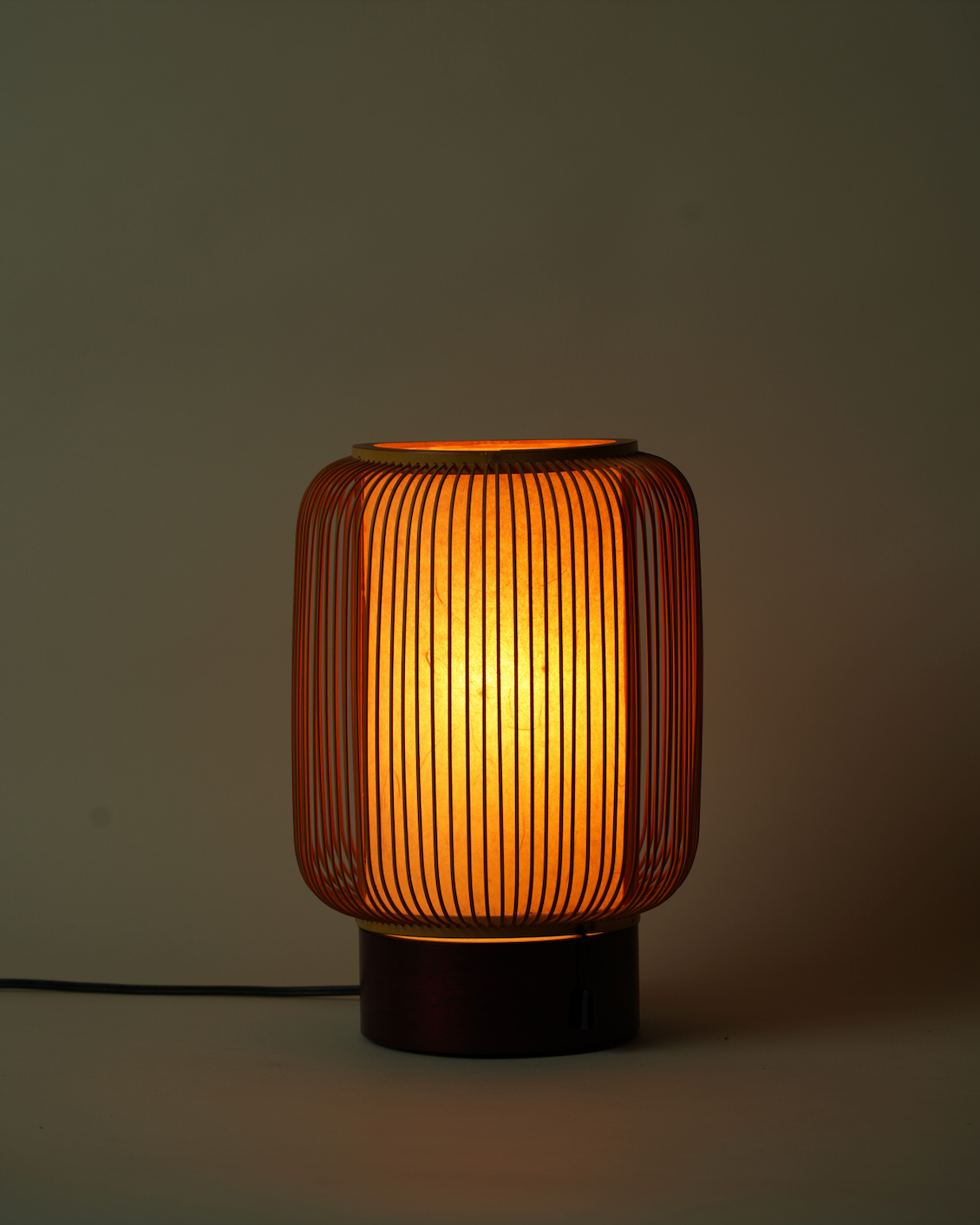 Referencing Japanese Mid-Century Modern design, the lantern table lamp is a striking sculptural piece. The delicately crafted bamboo and rich wooden base imbue the lamp with a natural organic quality. The light emitted is soft and warm.
