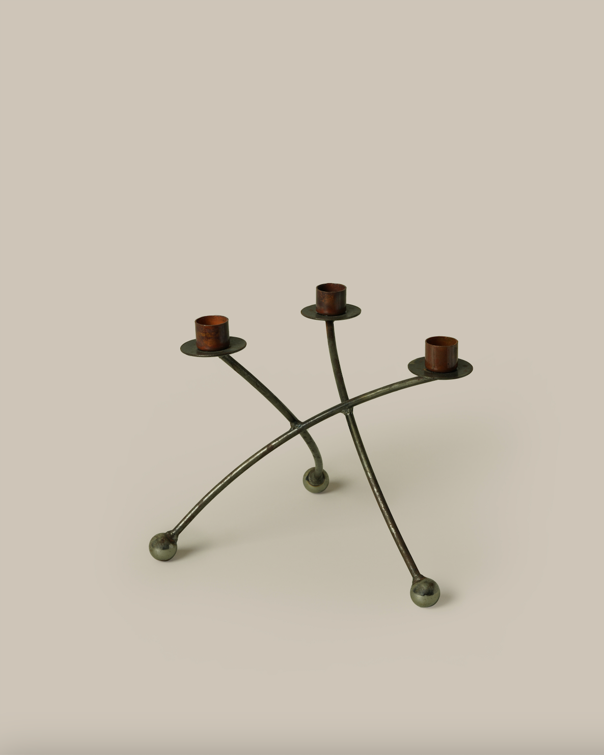 Clean lines and simple elegance characterize the profile of the sculptural candlestick. Curvilinear legs ending in spherical feet create a light balanced form. The aged patina lends the piece a rich vintage character while its simplicity is synonymous with modernist design.